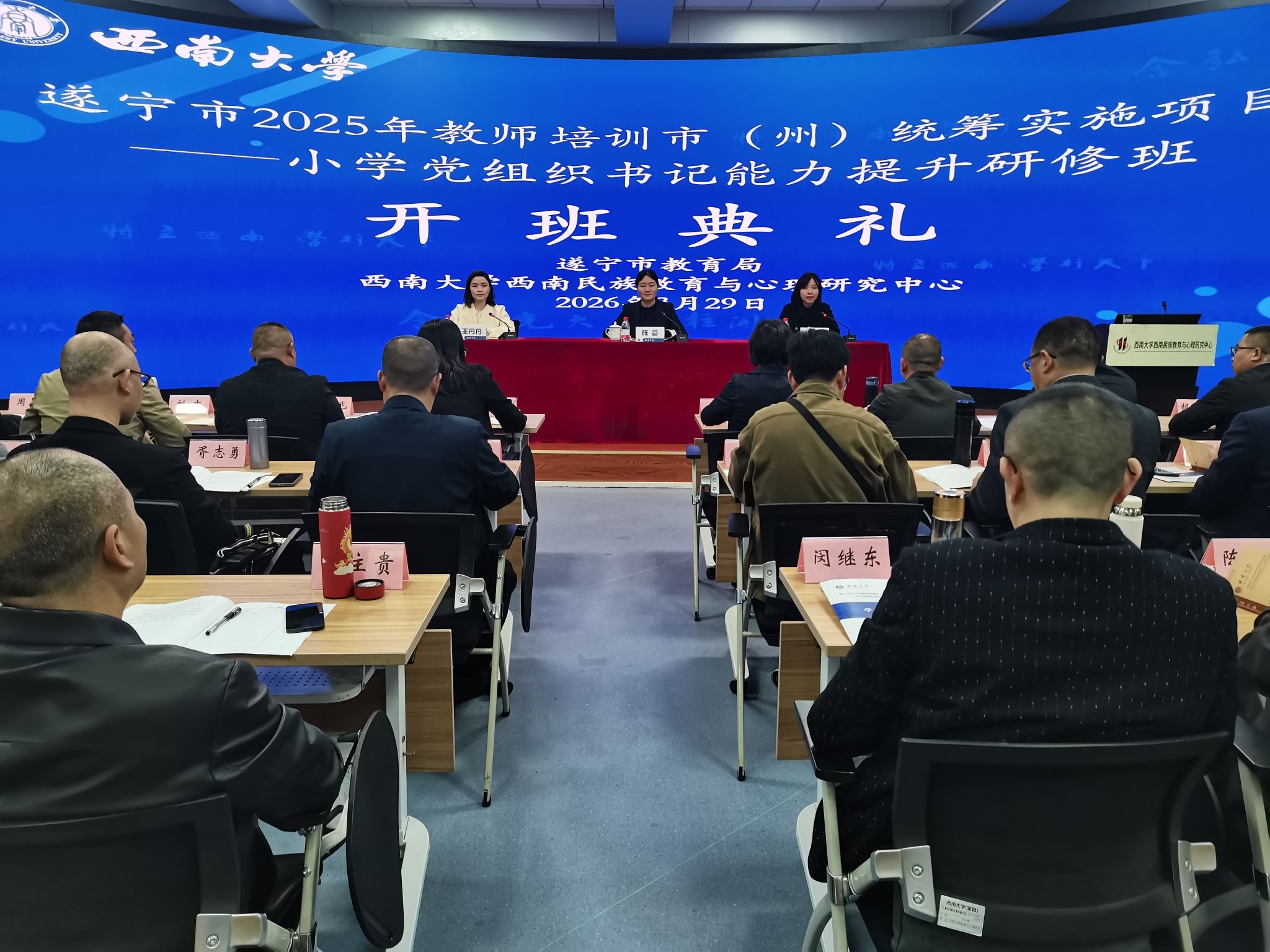 3月29日上午,由教育部人文社科重点研究基地西南大学西南民族教育与心理研究中心(以下简称“中心”)承办的“遂宁市2025年教师培训市(州)统筹实施项目—小学党组织书记能力提升研修班”开班仪式在西南民族教育与心理研究中心説乎斋201报告厅举行。中心副主任陈荟教授、中心综合办公室主任李彤、培训班班主任王丹丹以及40名来自遂宁市的小学党组织书记出席仪式,仪式由办公室主任李彤主持。