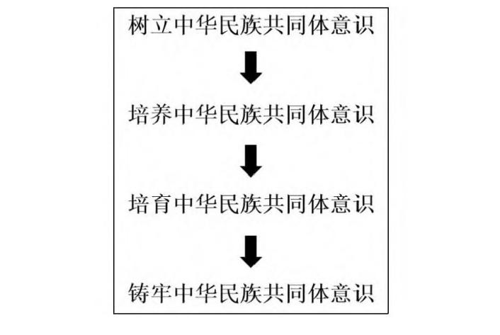 从逻辑意义来看,中华民族共同体意识话语的前缀动词经历“树立”“培养”“培育”“铸牢”等表述的改变,进一步明晰了该话语指导民族工作开展的要求和标准。2014年,“树立中华民族共同体意识”在第二次中央新疆工作座谈会上提出,同年9月在中央民族工作会议中表述为“培养中华民族共同体意识”,2015年中央第六次西藏工作座谈会表述为“培育中华民族共同体意识”,2017年党的十九大报告中最终确定为“铸牢中华民族共同体意识”(见图1)。前缀动词经数次调整后固定下来,“铸牢”不仅包含“树立”“培养”“培育”等含义,更深刻表明了其实践指向的进一步深化。第一,“树立”到“培养”的表述变化是对“意识”内涵认识的加深,意识的“树立”更多体现为一种阶段性的目标和结果,培养则强调需要经历持续性的过程。第二,“培育”是基于“培养”而提出的更高要求,强调时间的长度和投入的深度。第三,“培育”到“铸牢”话语变化明确了中华民族共同体意识教育需要达成的目标,“培育”是一种任务指向,并未阐明任务的要求及实现水准,“铸牢”的表述是对“培育”指向的进一步明确。