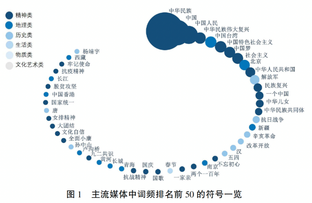 从图1中可见,主流媒体内容涉及的文化符号以精神类符号为主,此类符号以象征性的精神标识为特征,承载着中华民族共同的情感、精神、价值理念,既体现在“中华民族”“中国”“中国人民”等各种有形物质载体中,也包括“不忘初心”“两个一百年”“抗战精神”“女排精神”等无形的精神内涵。其次是地理类和历史类符号。地理类符号包括自然地理和人文地理,例如“北京”“长城”“黄河”“卢沟桥”等。历史类符号以各类历史事件和历史人物为主,例如“抗日战争”“改革开放”“五四”“孙中山”“杨靖宇”等。主流媒体通过挑选精神类、地理类、历史类符号,为用户建构了一个关于中华民族共同体的精神、地理与历史的想象场域。