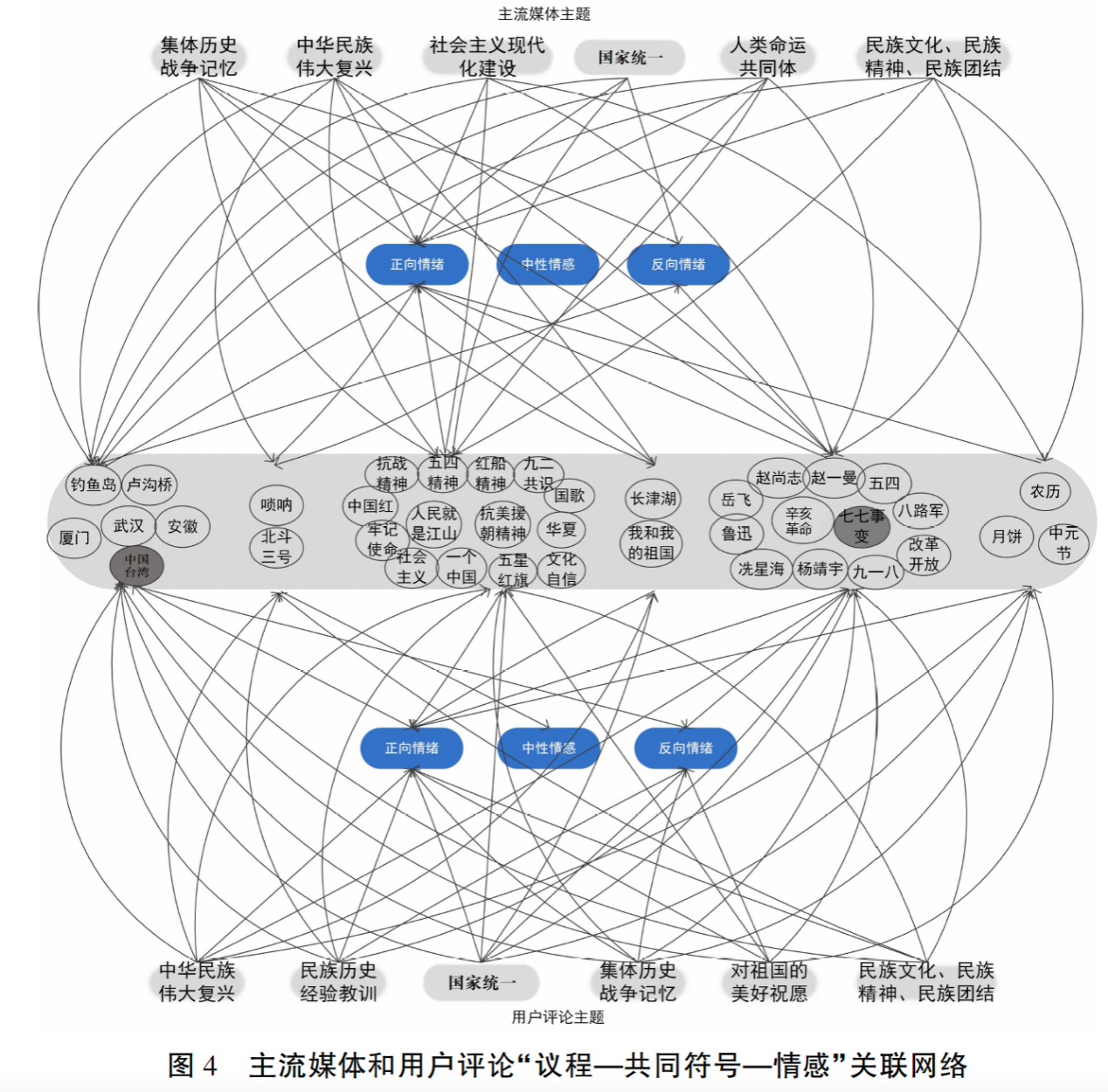 用户评论网络中有四类主题同时关联正向情绪和负向情绪。在国家统一主题中,用户关联网络与主流媒体一致,用户在与“七七事变”关联的内容中表达了激烈的负向情绪,在与“一个中国”“我和我的祖国”“月饼”关联的内容中则表达了“喜悦”“祝愿”等正向情绪。在民族历史经验教训主题中,用户情绪倾向亦呈现双向特征。一方面用户对历史上中华民族受到的欺辱和侵略表达了“愤怒”“憎恨”等负向情绪,另一方面则表达了“要吸取经验,奋勇向前”等自我激励的正向情绪。集体历史战争记忆、对祖国的美好祝愿两个主题也分别关联了两类情绪。此外,中华民族伟大复兴、民族文化(民族精神、民族团结)主题则主要连接正向情绪。如中华民族伟大复兴主题相关评论内容以正向情绪表达为主,用户通过多类文化符号的使用表达了作为中华民族共同体的一员对中华民族伟大复兴目标的认同感。在民族文化(民族精神、民族团结)主题中,用户评论常与“国歌”“中国红”“冼星海”“鲁迅”等文化符号勾连,以此表达个体的文化认同。