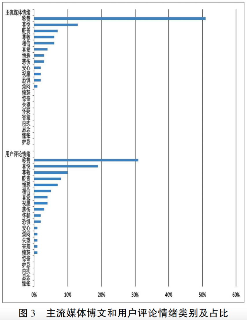参考相关文献,本文将快乐、赞扬、疚、思、慌、羞分别调整为喜悦、称赞、内疚、思念、慌张、害羞六类情感。[22]以此对媒体发布的博文和评论中涉及的情绪进行分类,最终分别得到21个细分情感类型。具体情绪类别及占比如图3所示。