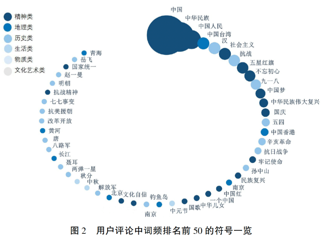 从图2中可见,用户评论中的文化符号表达以历史类符号为主,精神类为辅,地理类次之。历史类多以“抗战”“九一八”“五四”“辛亥革命”“孙中山”等历史事件和历史人物为主;精神类以“中国”“中华民族”“中国人民”“社会主义”“五星红旗”等符号为主;地理类主要涉及“中国台湾”“中国香港”等,上述符号明显建构了中华民族与他者的边界,当用户在使用这些符号时,实质已自觉地将自己视为中华民族共同体中的一员。