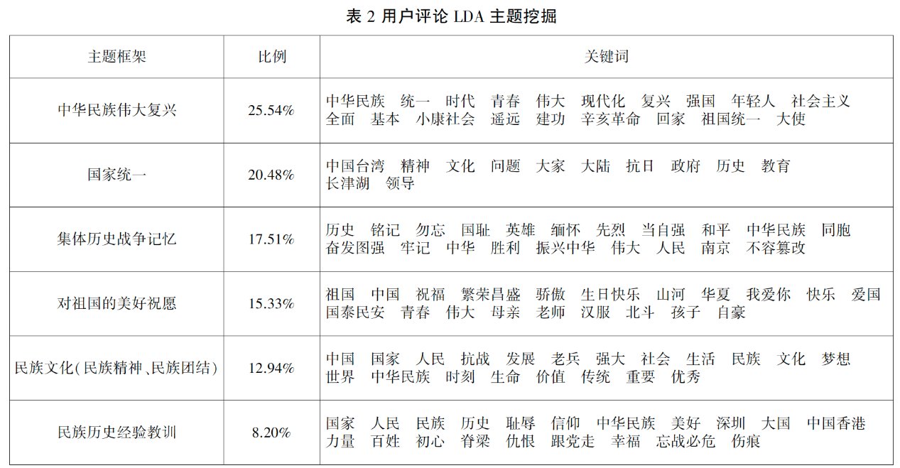 用户评论涉及的主题亦有六个类别,其中所占比例较高的是中华民族伟大复兴(25.54%)、国家统一(20.48%)和集体历史战争记忆(17.52%),其次是中华民族繁荣昌盛(15.33%)、民族文化(民族精神、民族团结)(12.94%)和民族历史经验教训(8.20%)。